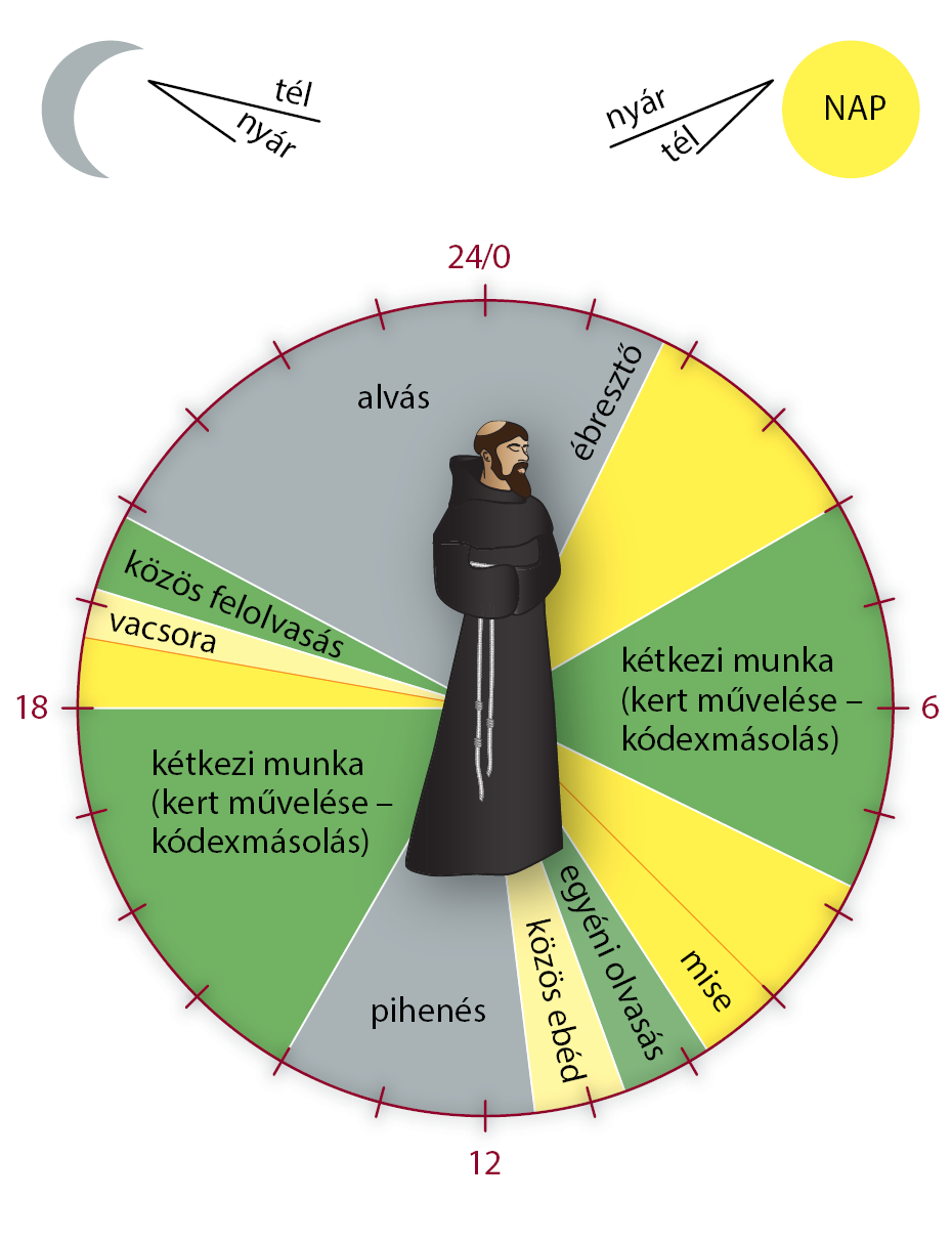 A középkori szerzetesi napirend szerint reggel 5 órakor volt az első szertartás, majd 7 órakor a nagymise, ebéd után, aztán délután újabb templomi szertartás következett. A vacsora utáni ájtatosságot követően nyáron este 6, télen 5 óra tájban tértek nyugovóra. Éjfélkor (vagy előtte egy órával) is tartottak misét.